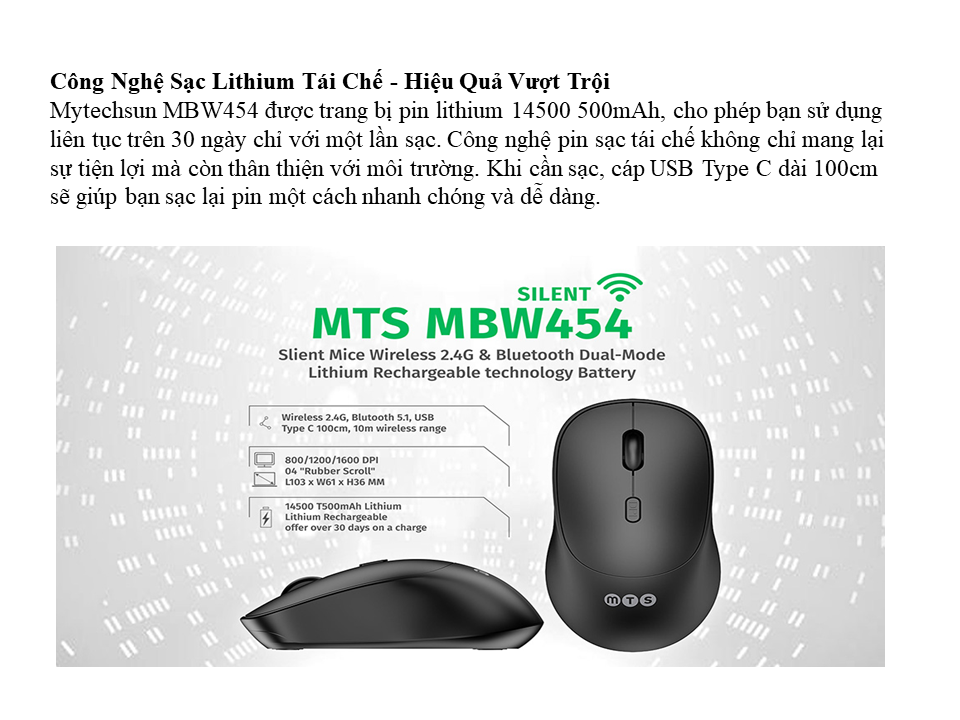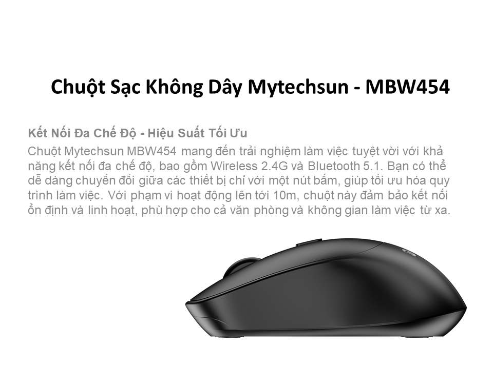 Chuột không dây Mytechsun MBW454 không chỉ đáp ứng nhu cầu kết nối đa chế độ mà còn mang đến trải nghiệm làm việc yên tĩnh và hiệu quả với thiết kế nhỏ gọn và công nghệ pin lithium tái chế. Đây là lựa chọn lý tưởng cho những ai cần một thiết bị làm việc tiện lợi, linh hoạt, và hiện đại.