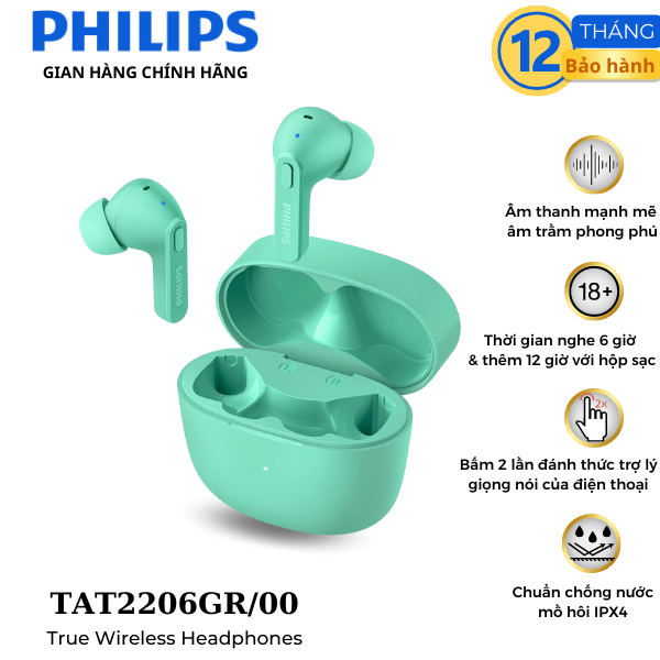 Tai nghe nhét tai Bluetooth PHILIPS TAT2206PK - màu xanh (18 tiếng)